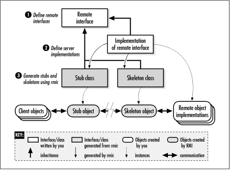 When a client gets a reference to a remote object (details on how this reference is obtained come later) and then calls methods on this object reference, there needs to be a way for the method request to get transmitted back to the actual object on the remote server and for the results of the method call to get transmitted back to the client. This is what the generated stub and skeleton classes are for. They act as the communication link between the client and your exported remote object, making it seem to the client that the object actually exists within its Java VM.