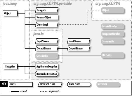 The org.omg.CORBA.portable package contains interfaces, classes, and exceptions used by the portability layer of the CORBA API. The portability layer provides facilities that allow code to be shared between different ORB providers. Figure 33-1 shows the class hierarchy of this package.
