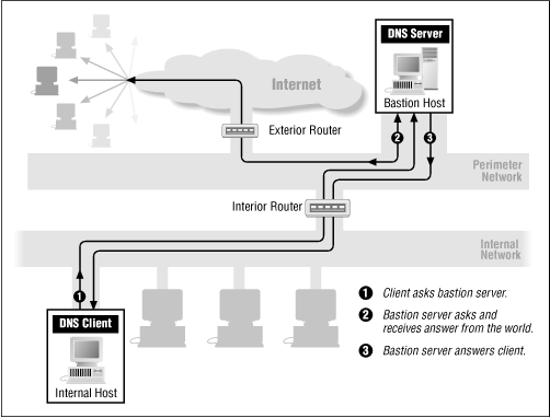 When a DNS client on the bastion host asks about an external system, the internal DNS server forwards the query to the bastion DNS server. The bastion server obtains the answer from the appropriate DNS servers on the Internet, and then relays the answer back to the internal server. The internal server, in turn, answers the original client on the bastion host.