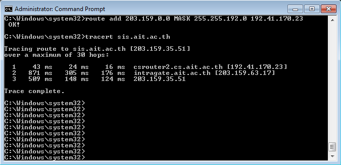 | 10. | You can manually add a route to AIT network Open a command prompt with administrator privileges (Start, All Programs, Accessories, Right click on Command Prompt, Run as Administrator); Enter the following command: route add 203.159.0.0 MASK 255.255.192.0 192.41.170.23 The screenshot show what result you expect. |