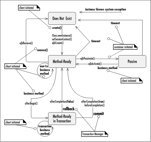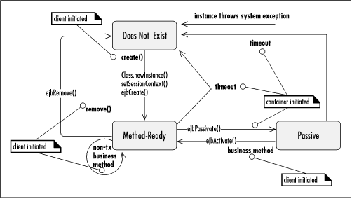 Table B-5 and Table B-6 summarize the operations that are legal for a stateful session bean in EJB 1.1 and 1.0.