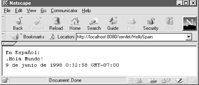 Example 12-4 shows the HelloSpain servlet using a DateFormat object to print the current time in a format naturally understood by a Spanish-speaking recipient.