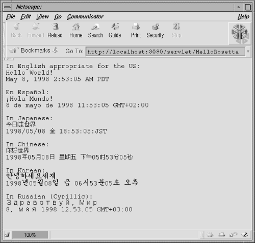 Example 12-7 shows a servlet that uses the UTF-8 encoding to say "Hello World!" and tell the current time (in the local time zone) in English, Spanish, Japanese, Chinese, Korean, and Russian. A screen shot of the servlet's output is shown in Figure 12-5.